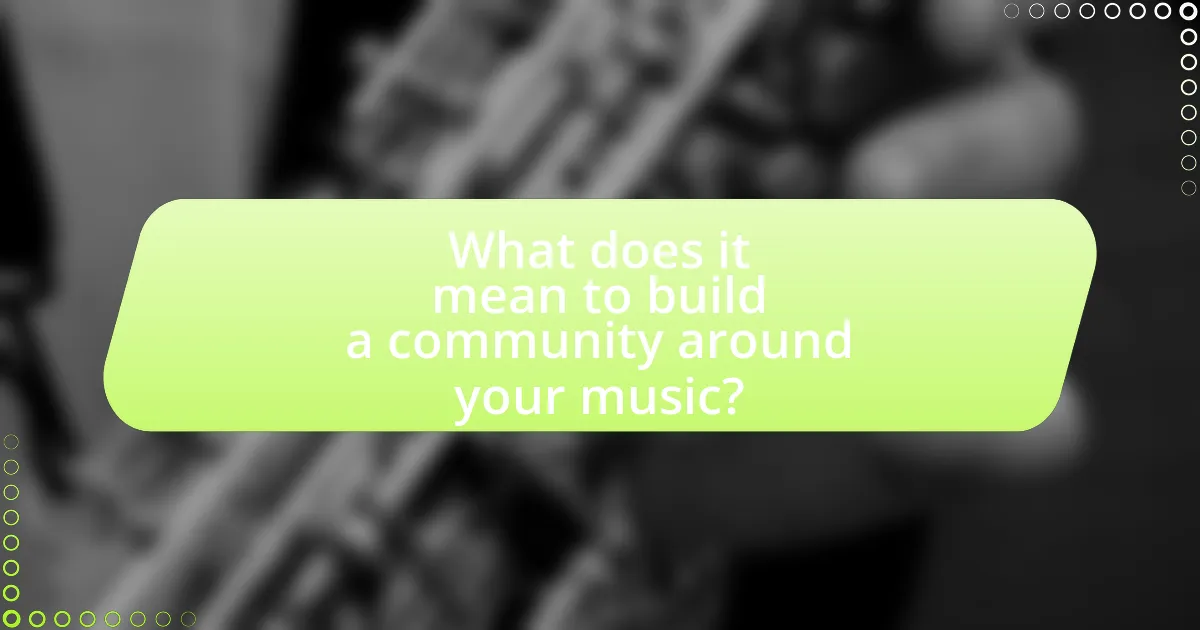 Building a community around your music means creating a supportive network of fans and collaborators who engage with your work and contribute to its growth. This involves fostering relationships through social media, live events, and interactive platforms, allowing fans to feel a sense of belonging and investment in your artistic journey. Research indicates that artists with strong community engagement often experience increased loyalty and support, leading to higher concert attendance and merchandise sales. For instance, a study by the Berklee College of Music found that artists who actively engage with their audience can see a 30% increase in fan retention rates.